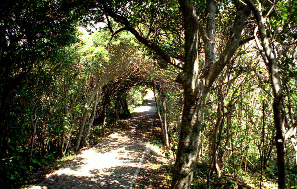 で、大島というところは結構断崖の島で、その関係でご覧のように展望台からの見晴らしが絶景でして…。そして、展望台「あるある」の遊歩道もあったりして、階段で波止場付近にも降りることができるようになっているんですね。